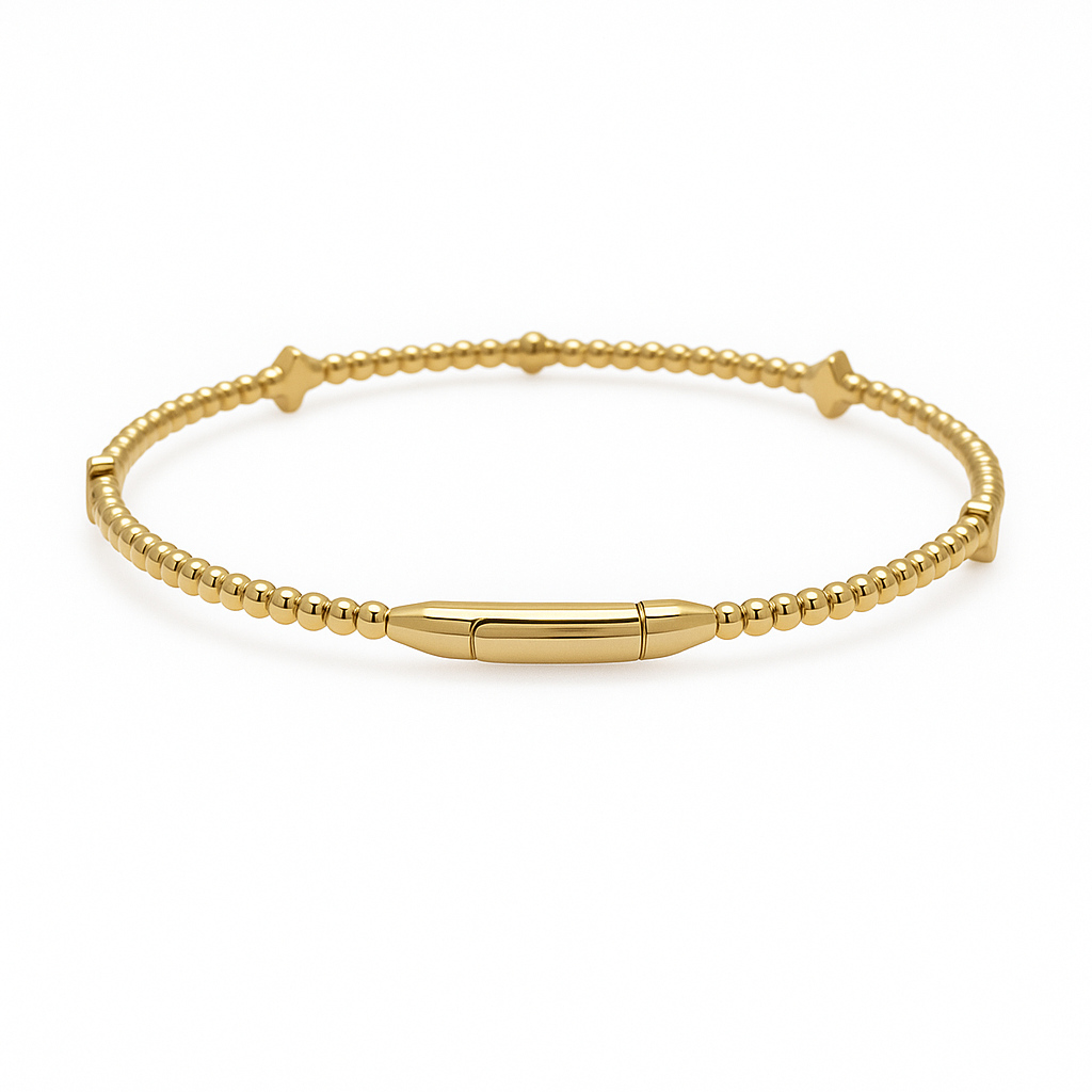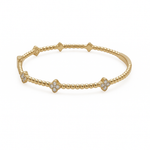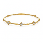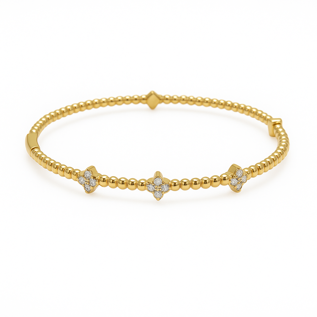Dazzle with timeless sophistication. This exquisite flexible bangle bracelet, crafted in radiant 14K yellow gold, features a charming beaded design elegantly punctuated by three sparkling diamond clover stations. Each meticulously set diamond clover symbolizes luck, faith, hope, and love, making this piece not just a beautiful accessory, but a meaningful treasure.