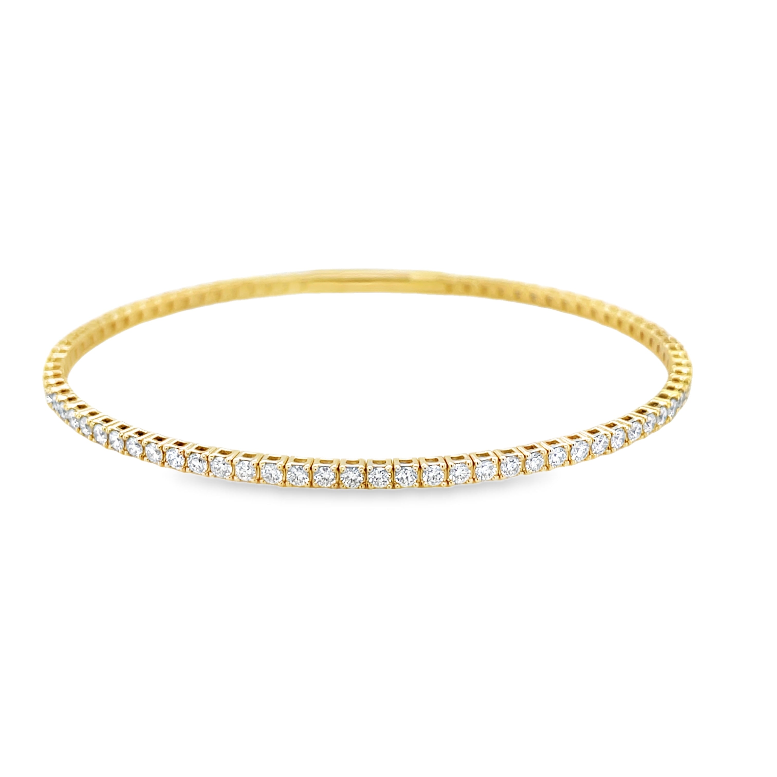 This bracelet embodies refined simplicity and enduring elegance. The continuous line of diamonds creates a balanced silhouette that feels substantial yet graceful on the wrist. Its flexible construction allows for comfortable, effortless wear, while the warmth of yellow gold enhances the natural brilliance of each stone. A timeless piece designed to transition seamlessly from everyday sophistication to evening refinement.