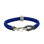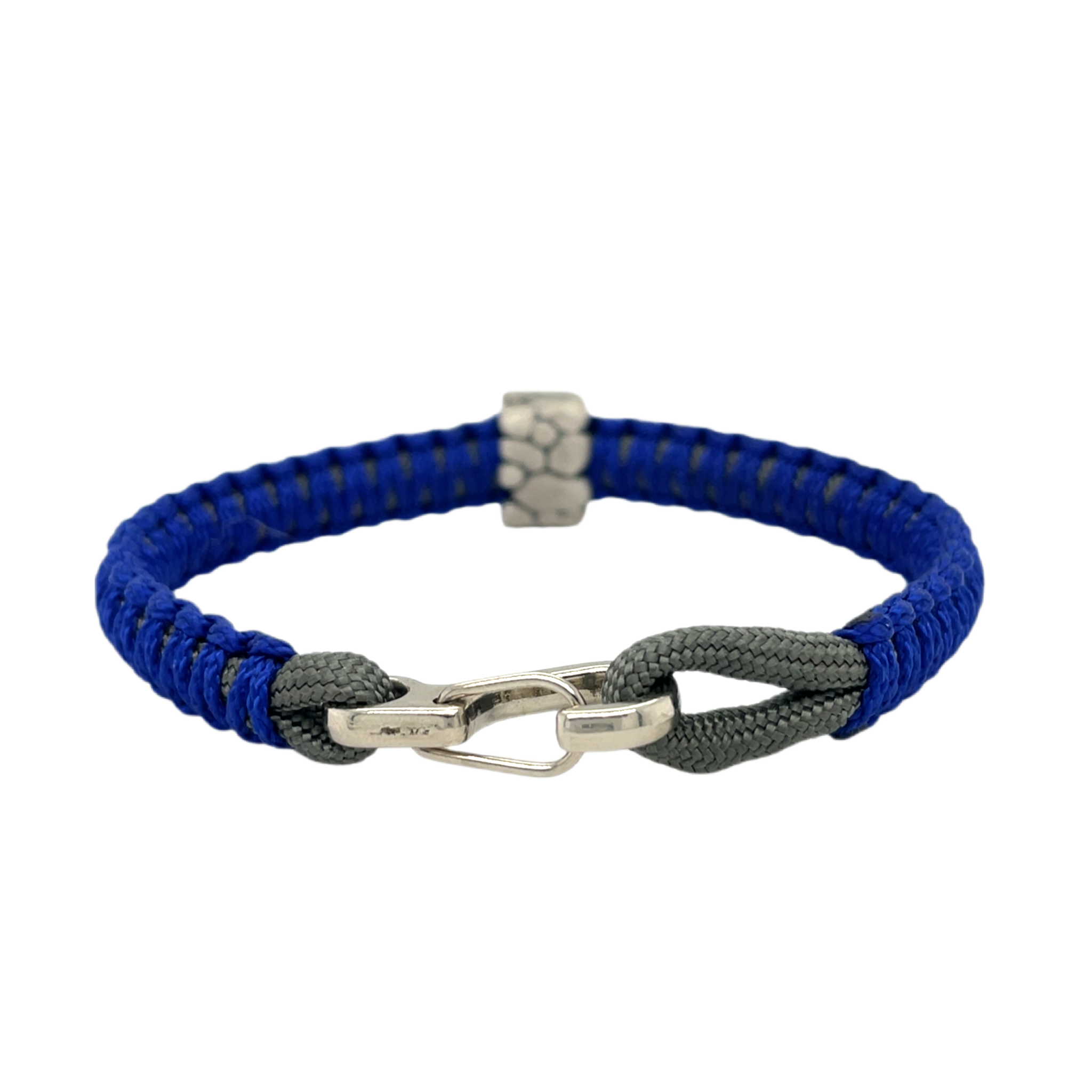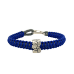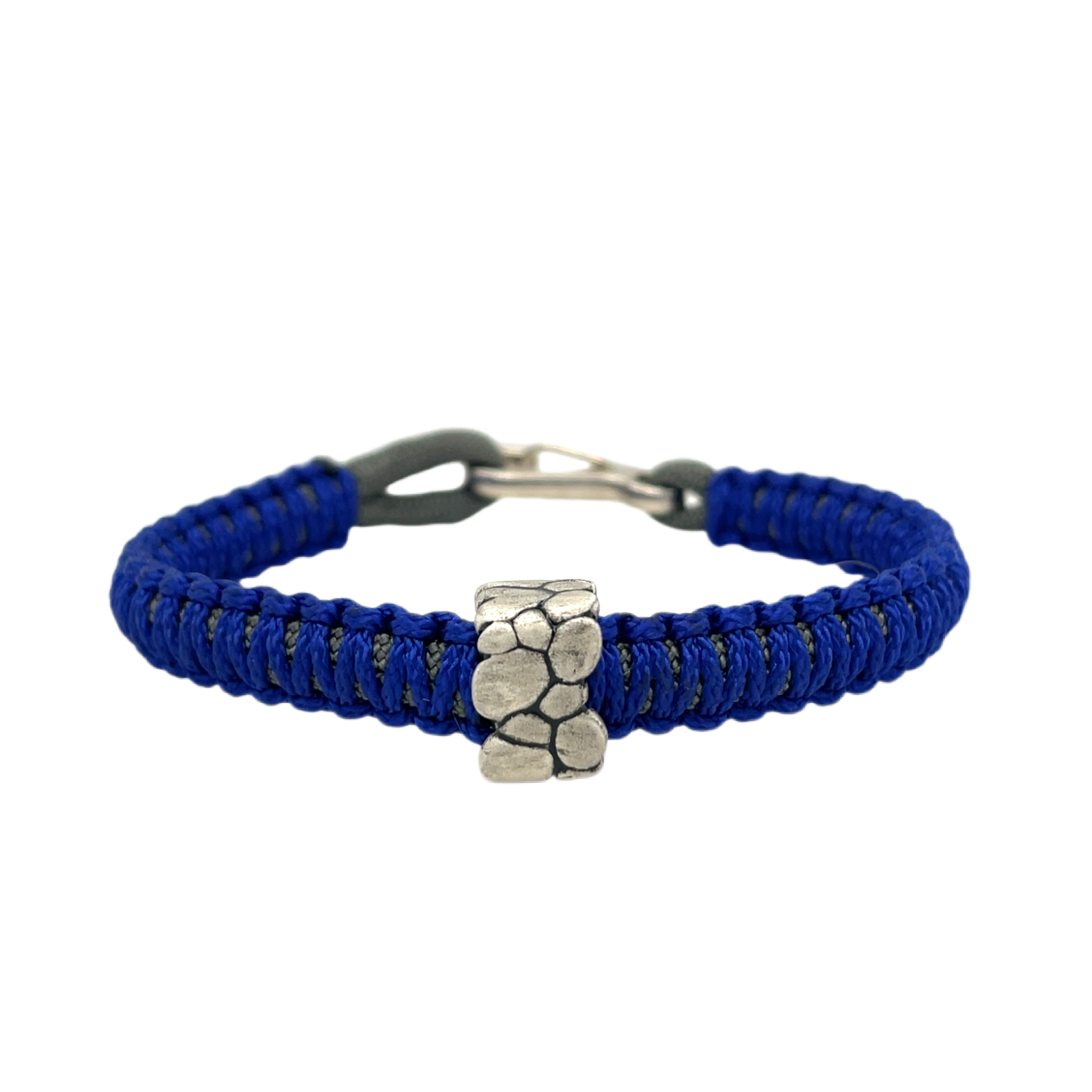 This Blue & Grey Paracord Bracelet blends rugged durability with elevated craftsmanship. Handcrafted from rich blue paracord with a contrasting grey core, the design is highlighted by a striking sterling silver square Boulder Mountain bead, featuring an organic, stone-inspired texture. A coordinating sterling silver shackle clasp completes the look, offering both security and refined detail. The result is a versatile bracelet with a modern, adventurous aesthetic.