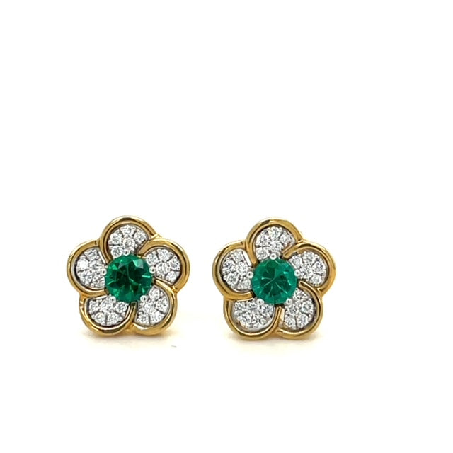 Diamond and Emerald Flower Earrings in Yellow Gold
