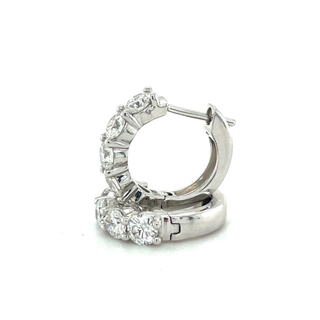 Five beautiful big round diamonds create a wow-factor of sparkle in these white gold huggie earrings. With a combined weight of 2.17 carats, these hoops are absoluteyl stunning.