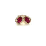 Set in 14k yellow gold, 19 round delicate diamonds border a gorgeous pear-shaped red ruby creating these rich stud earrings.
