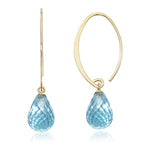 These dangle earrings feature a gorgeous briolette-cut genuine Blue Topaz and are set in 14k yellow gold.