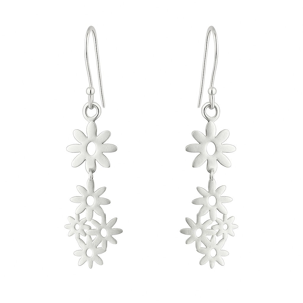 Playful, feminine, and effortlessly chic — these sterling silver flower earrings capture the beauty of nature in motion. Each earring features a cascading design of delicate open-petal blossoms that shimmer with a soft matte finish. Light and airy, they sway gracefully with every movement, adding a touch of joyful elegance to your look.