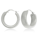 Make a bold yet refined statement with these Silver Textured Hoop Earrings. Featuring a wide hoop silhouette with an intricate diamond-cut lattice pattern, these earrings shimmer beautifully with every movement. Crafted in sterling silver, the design combines elegance and durability while offering a modern twist on a classic hoop. The hinged closures provide secure, comfortable wear, making them the perfect accessory to transition seamlessly from day to night.
