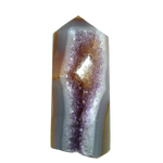 This Small Multi-Color Agate Tower showcases flowing layers of soft gray, warm honey, and subtle earth tones, beautifully framing a sparkling druzy crystal cavity. Polished into a classic tower silhouette, the exterior highlights agate’s natural banding while the interior druzy glistens with delicate crystal points. Each piece is naturally formed and entirely one of a kind, offering a striking blend of color, texture, and depth.