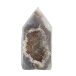 This Medium Smoky Agate Tower features rich, smoky gray and soft taupe layers of natural agate, beautifully framing a sparkling druzy crystal cavity at its center. Polished into a classic tower silhouette, the smooth exterior reveals flowing banding while the raw interior crystals add depth, texture, and natural brilliance. Each piece is one of a kind, shaped by nature and refined by hand.