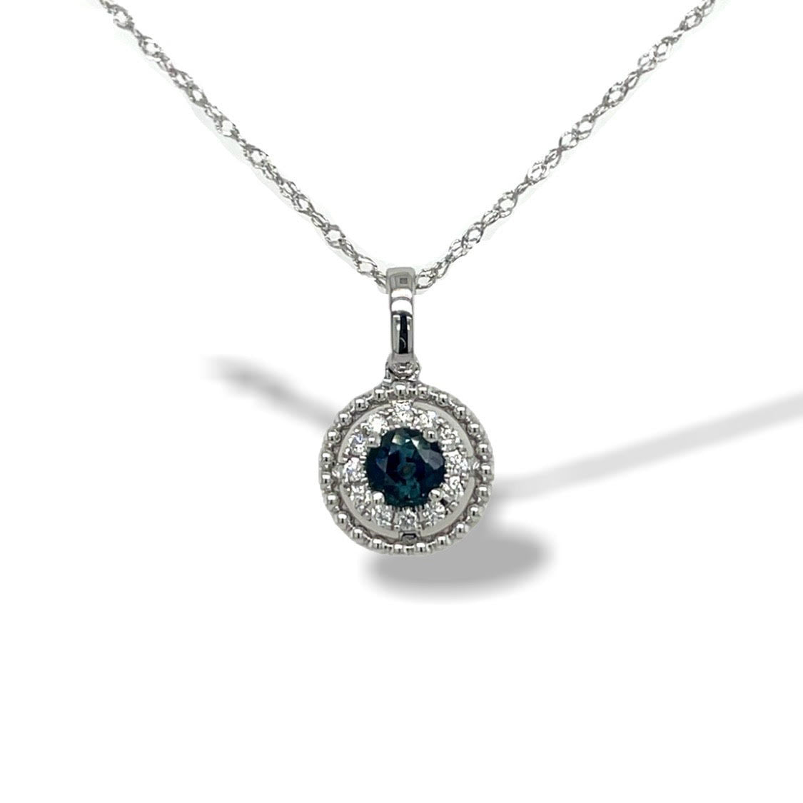 14K White Gold Blue Topaz & Diamond Halo Pendant