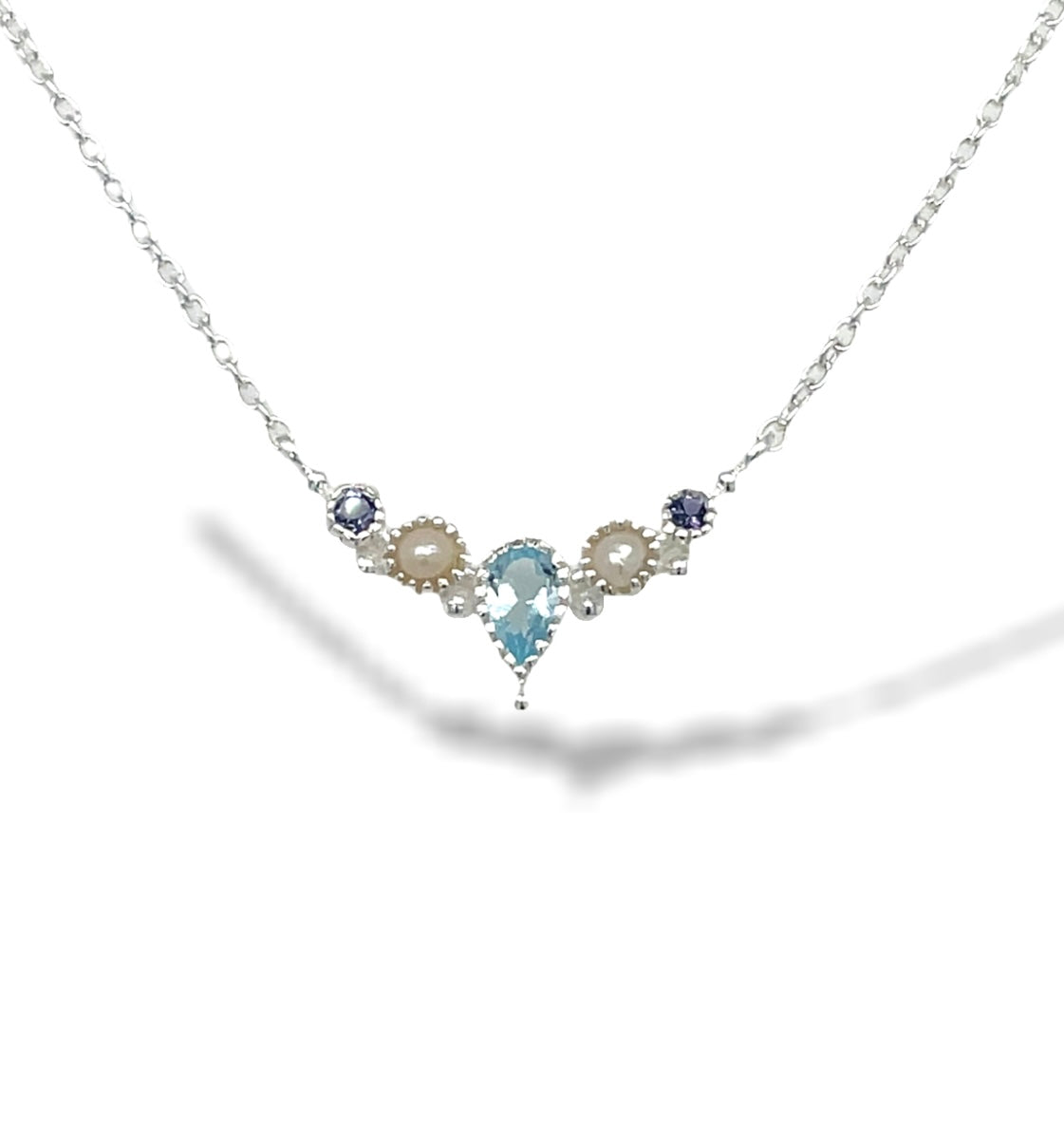 This necklace radiates calm, clarity, and quiet beauty. The blue topaz brings a fresh sparkle reminiscent of clear skies, while the moonstone’s iridescence adds a dreamy glow, and the iolite provides subtle depth. Together, they create a piece that’s graceful, meaningful, and versatile — perfect for layering or wearing solo as a delicate statement of elegance and light.