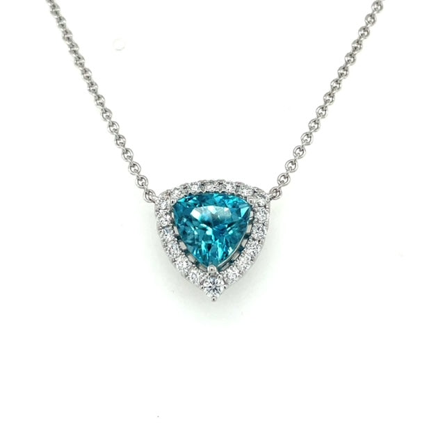 There is no shortage of sparkle in this spectacular Blue Zircon & Diamond pendant. A 4.22ct trillion cut Blue Zircon is encased in shimmering diamonds and set stationary on an 18" adjustable cable chain.