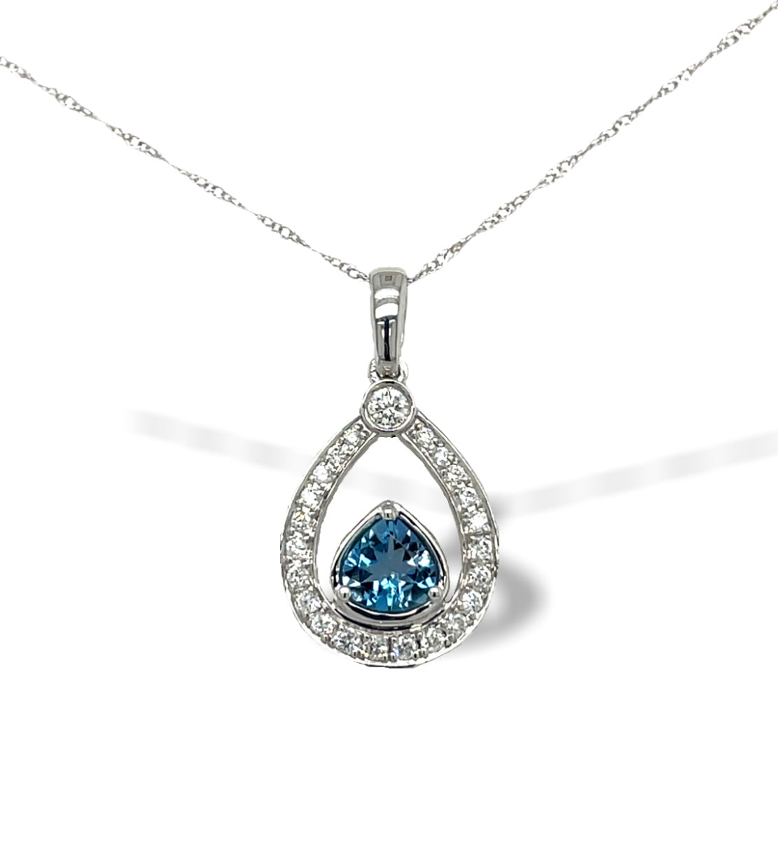 This stunning pendant features a beautiful aquamarine, elegantly set in a white gold frame adorned with sparkling accent diamonds. Its teardrop shape adds a touch of sophistication, making it the perfect accessory for any occasion.