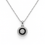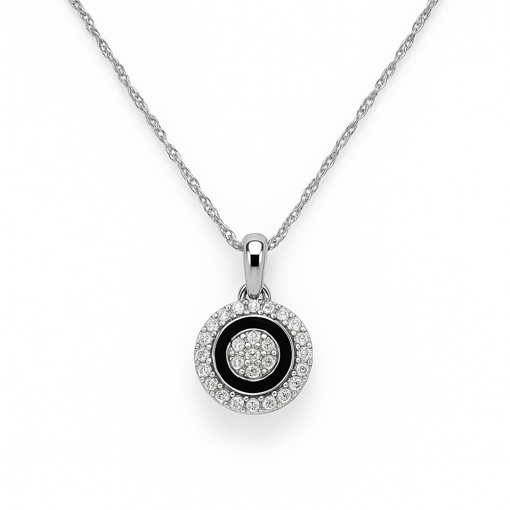 This elegant pendant necklace is crafted in 14 karat white gold, featuring a sparkling cluster of round brilliant diamonds at its center. A sleek circle of black enamel adds striking contrast, framed by a halo of shimmering diamonds for maximum brilliance. Suspended from a delicate rope-style chain, this timeless design blends modern sophistication with classic elegance.