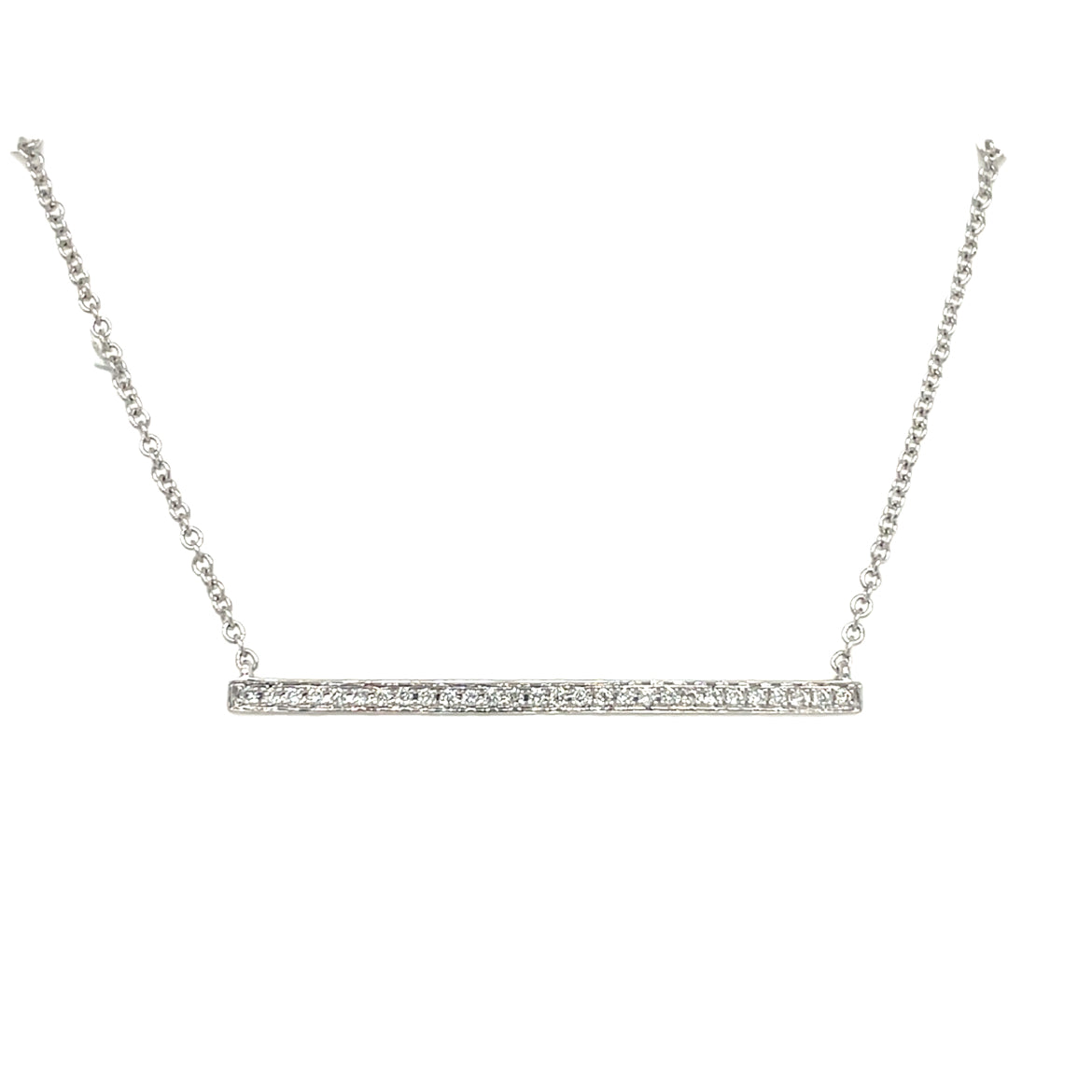 This stunning white gold bar necklace is the perfect accessory for any occasion. Its sleek design features a delicate chain that beautifully complements the shimmering bar pendant, making it a versatile piece for both casual and formal outfits.