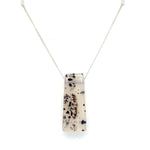 A stunning example of nature’s artistry, this Montana Agate pendant showcases the stone’s signature dendritic inclusions in a contemporary tapered rectangle cut. Soft, milky translucence blends with earthy specks and branch-like plume patterns, creating a scene reminiscent of wild mountain brush and drifting snow. Finished in a sleek sterling silver bezel and paired with a matching chain, this piece brings an elegant, organic beauty to everyday wear.