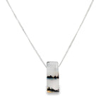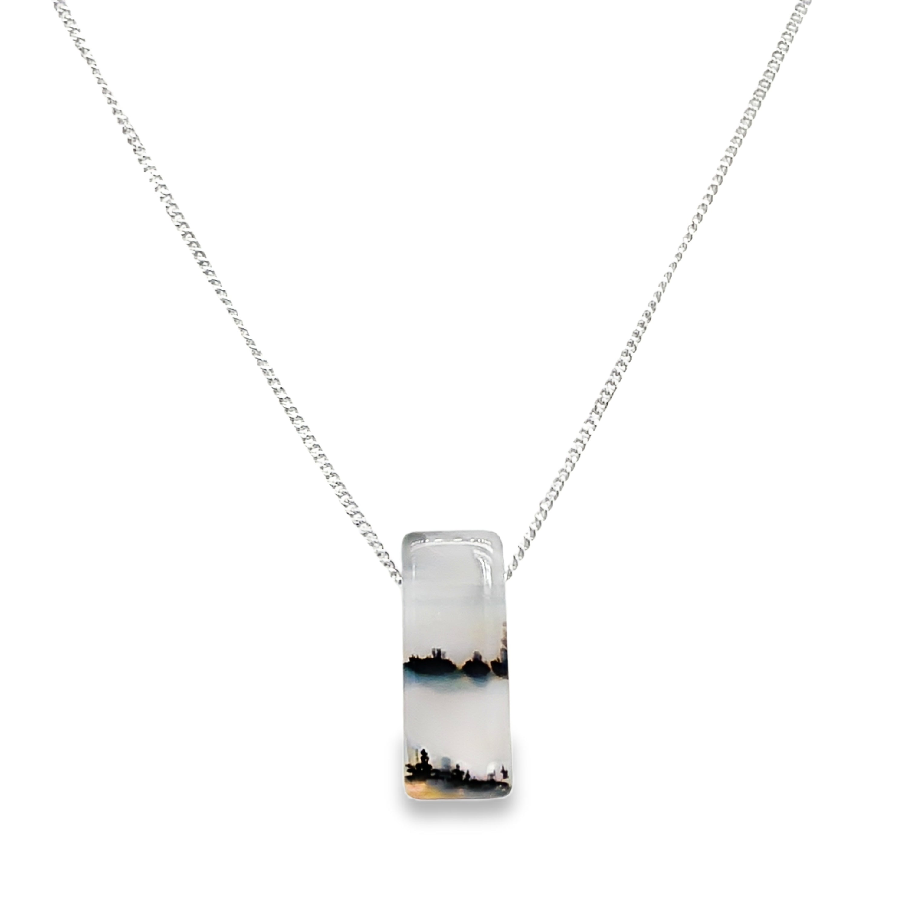 A breathtaking Montana Agate pendant that captures the quiet poetry of the natural world. Hand-cut into a sleek rectangular silhouette, this gemstone reveals an enchanting scene within—misty horizon tones and dendritic inclusions reminiscent of distant evergreens at sunrise. Suspended from a shimmering sterling silver chain, this piece blends organic beauty with modern elegance.