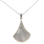 Elegant and luminous, this Mother of Pearl pendant captures the timeless beauty of the sea in a refined, modern design. The fan-shaped shell shimmers with soft iridescent hues — pearly whites, gentle pinks, and silvery blues that shift with the light. Delicately framed in sterling silver with a filigree-inspired bail, this piece evokes ocean calm and moonlit grace. A perfect blend of natural radiance and sophistication, it adds a touch of effortless elegance to any look.