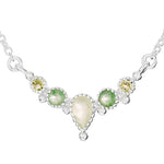 Delicate, fresh, and effortlessly elegant—this sterling silver necklace features a graceful row of soft green gemstones in varying shapes and hues. At the center sits a pear-cut stone, framed by round accents on each side, creating a gentle gradient of color that feels serene and natural. Its minimalist silhouette makes it perfect for everyday elegance while still carrying a touch of luxury.