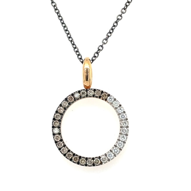 A perfect mix of dark and light! This 18k rose gold & black rhodium pendant flaunts 19 brown diamonds & 11 white diamonds.