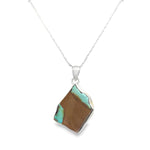 This striking Royston Turquoise pendant captures the natural artistry of the Nevada desert, where veins of soft sky blue flow effortlessly through rich golden-brown matrix. Each stone is a unique canvas of earth and sky, framed in smooth, polished 925 sterling silver that highlights its organic beauty. Handcrafted to preserve the stone’s raw character, this pendant carries a timeless elegance rooted in nature’s design.