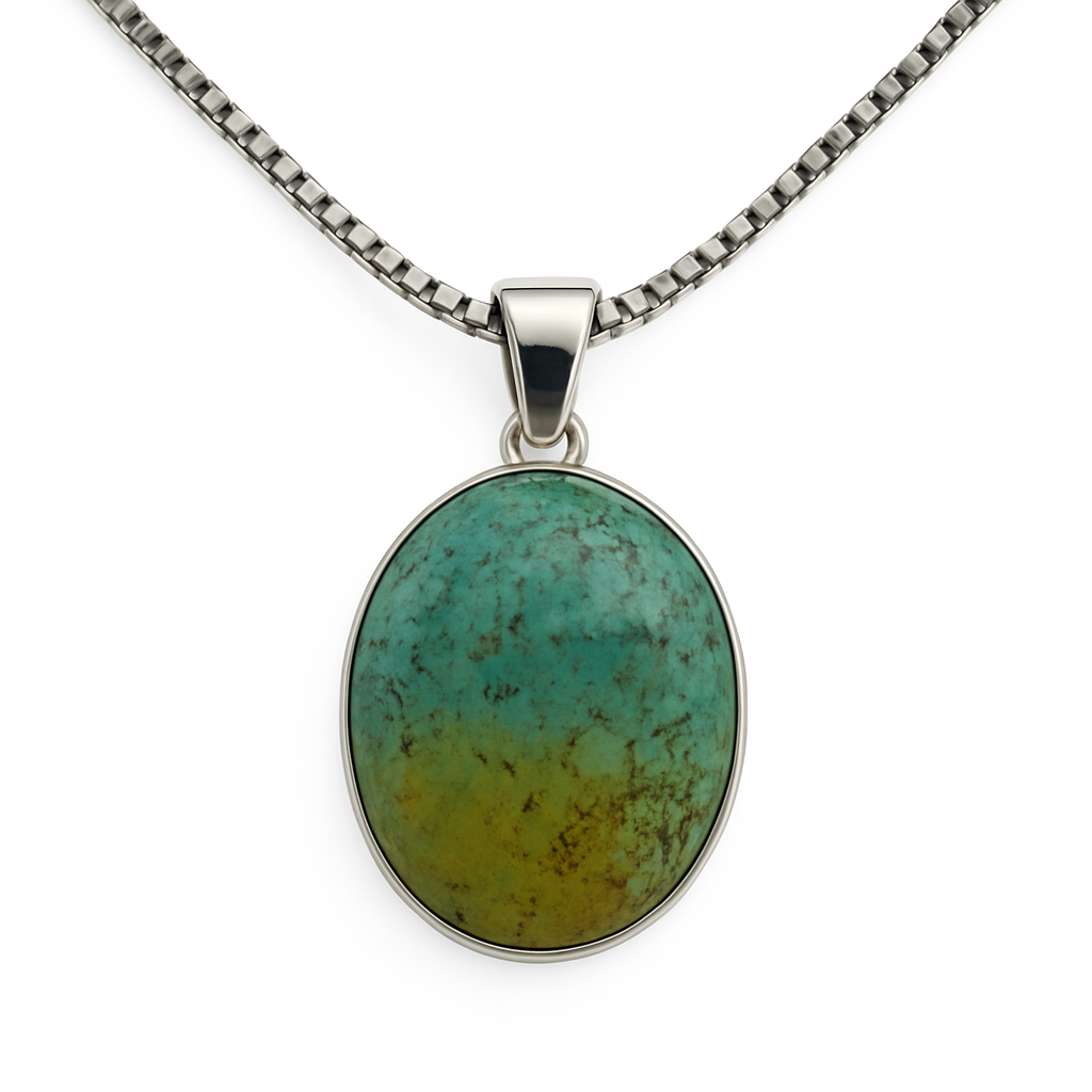 Showcasing a striking oval-cut turquoise gemstone, this pendant radiates natural beauty with its unique blend of vivid blue-green hues and earthy golden-brown matrix. Set in polished sterling silver and paired with a sleek silver chain, the necklace brings together timeless craftsmanship and the one-of-a-kind character of genuine turquoise. A bold yet elegant accessory, perfect for adding a touch of color and artistry to any look.