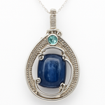 This artisan-crafted pendant features a striking rectangular cabochon kyanite gemstone, known for its deep indigo hues and natural shimmer. The kyanite is elegantly framed in an intricate sterling silver wire-wrapped design, accented with a sparkling round aqua stone that adds a touch of brilliance. Suspended from a sterling silver chain, this one-of-a-kind pendant blends natural beauty with handcrafted artistry, making it a unique statement piece for any collection.