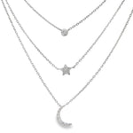 Discover the beauty of simplicity with this elegant set of layered white gold necklaces. Featuring a delicate crescent moon, a shimmering star, and a sparkling diamond, these pendants are perfect for adding a touch of celestial charm to any outfit. Ideal for both casual and formal occasions, they make a thoughtful gift for someone special or a delightful treat for yourself.