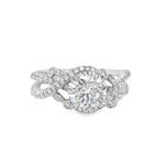 This stunning engagement ring features a brilliant round lab created diamond at its center, surrounded by a delicate halo of smaller natural diamonds. The intricate band design adds a touch of elegance, making it the perfect symbol of love and commitment.