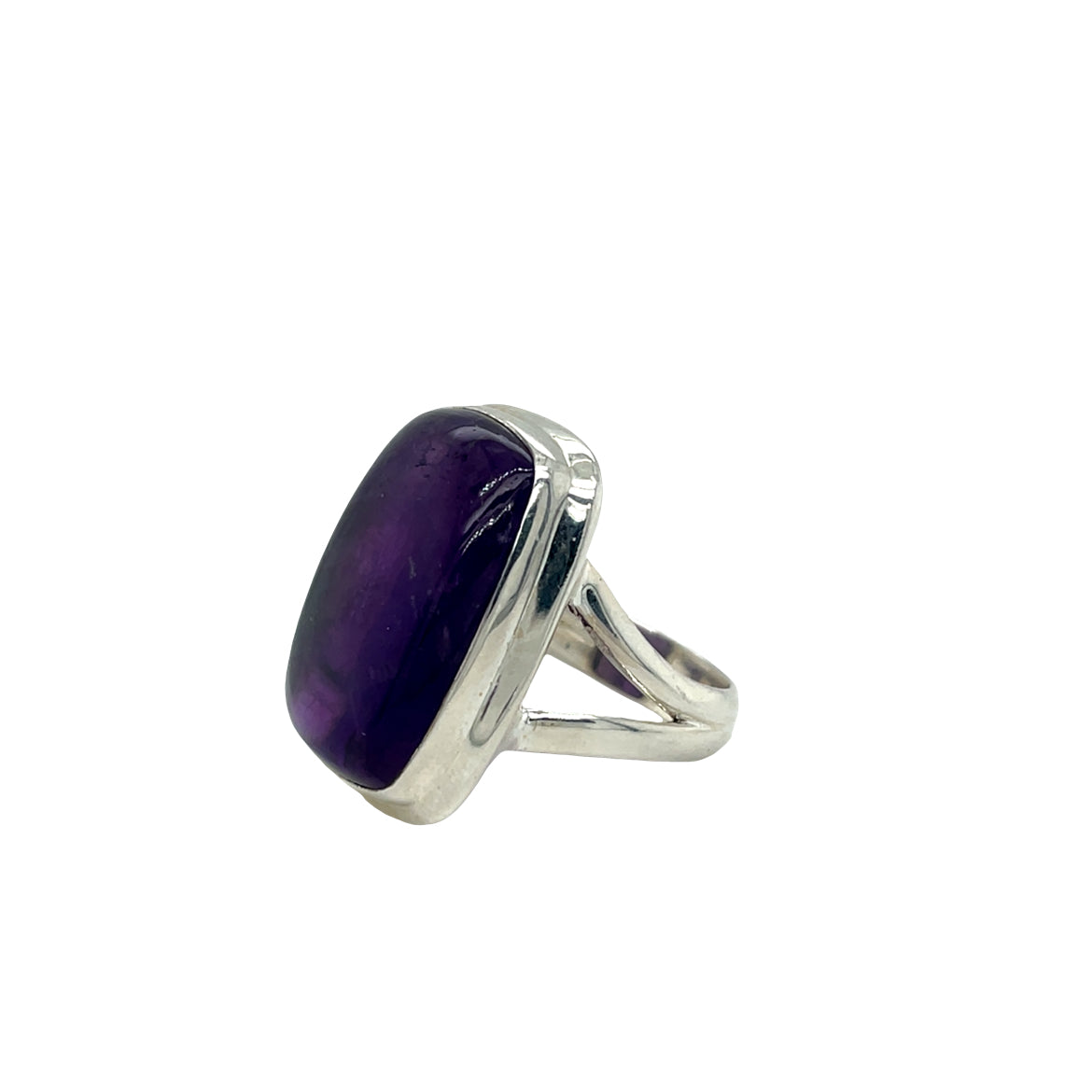 This bold and elegant ring features a striking deep purple amethyst gemstone, celebrated for its rich, regal color and natural clarity. The gem’s smooth rectangular cabochon cut captures light beautifully, revealing subtle flashes of violet with every movement.
