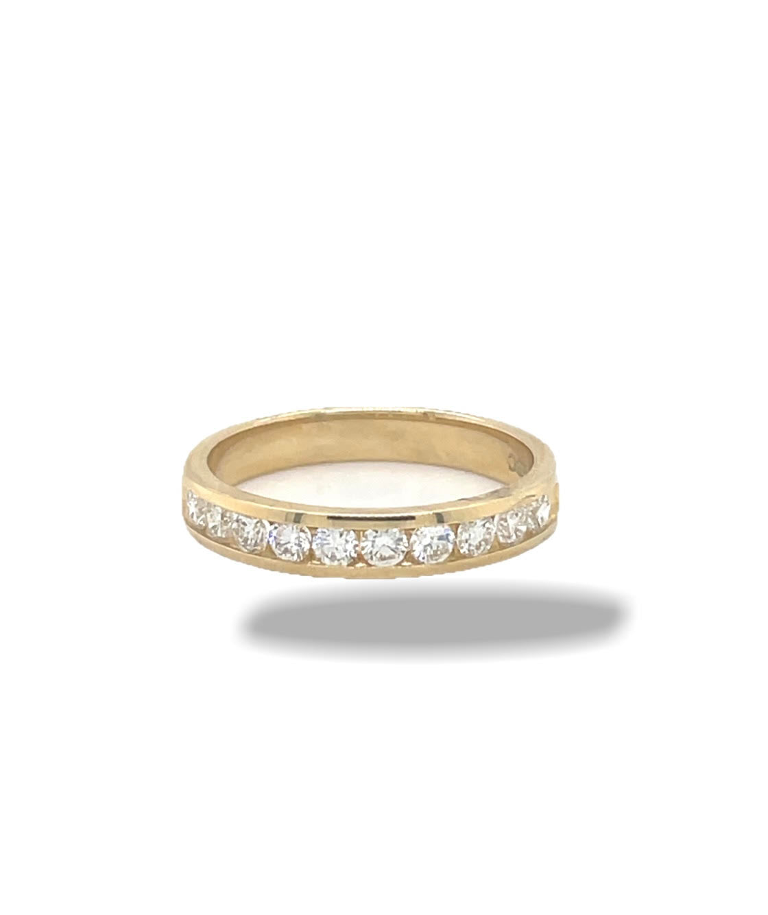 This timeless band is crafted in rich 14K yellow gold and features 10 round brilliant-cut diamonds totaling 0.50 carats, set in a sleek channel setting. The diamonds are aligned in a continuous row, offering a clean and elegant look with secure placement and uninterrupted sparkle.
