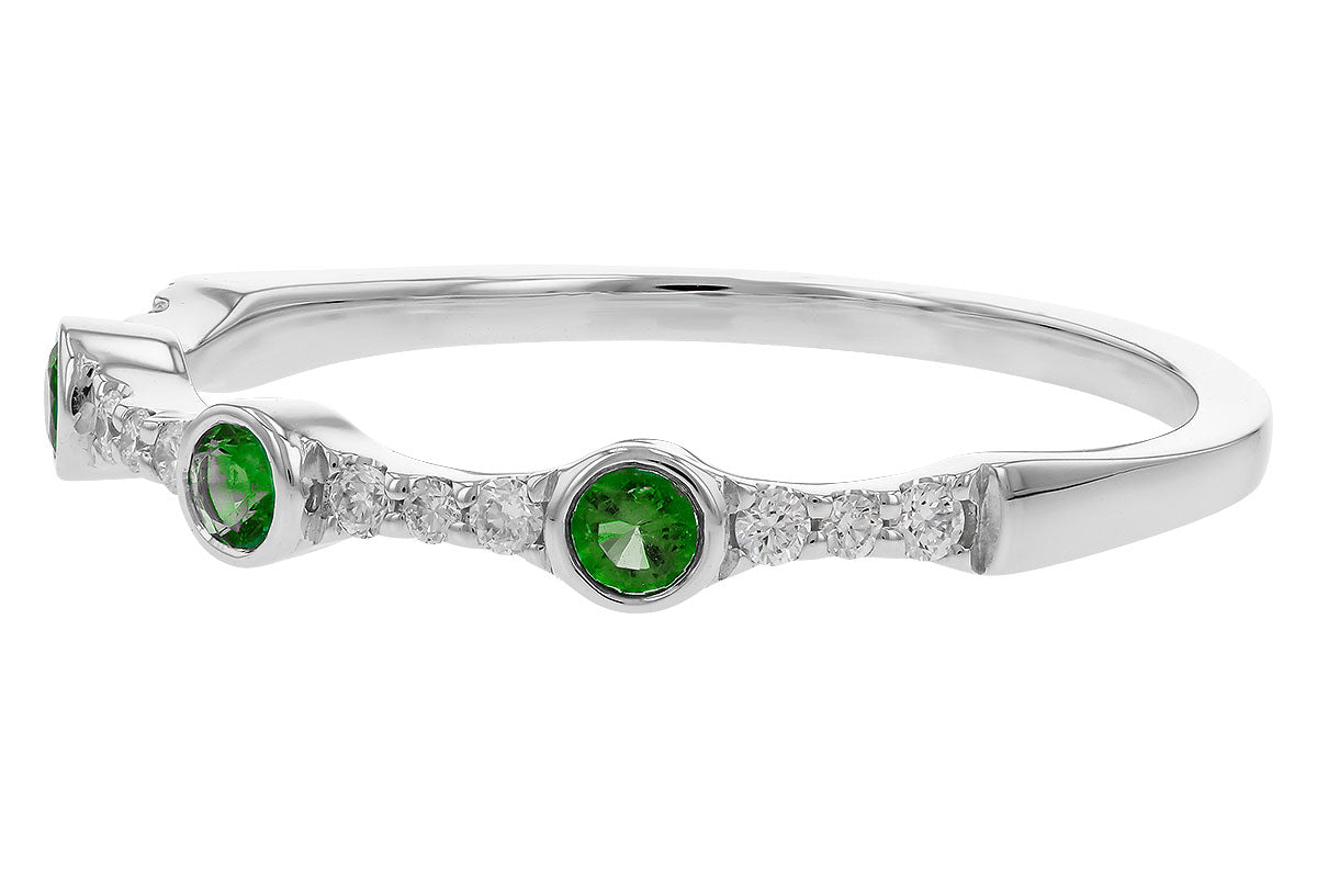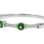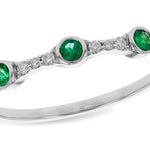 This enchanting ring showcases three vibrant emeralds totaling 0.11 carats, set in gleaming 14K white gold. The emeralds are arranged in a classic trio design, with the center stone slightly larger, flanked by two smaller emeralds. Between them, 0.09 carats of round diamonds add a brilliant contrast, enhancing the ring’s sparkle and elegance.