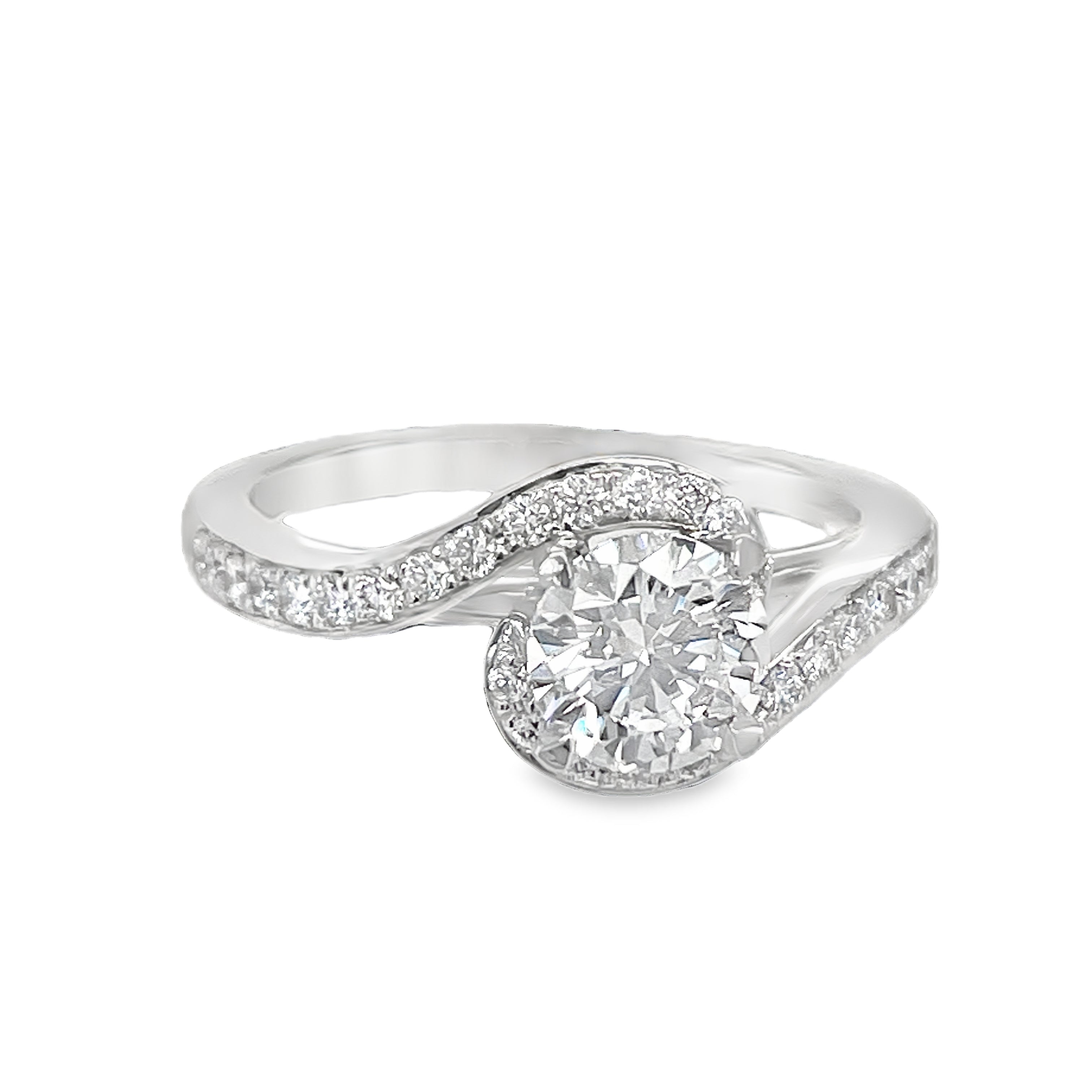 This stunning diamond engagement ring features a lab grown brilliant round-cut center stone, elegantly surrounded by a wave of natural shimmering smaller diamonds. Crafted in high-quality white gold, it radiates sophistication and timeless beauty, making it the perfect symbol of love and commitment.