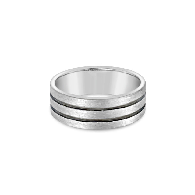 Two black enameled grooves accent this mens simple titanium band.