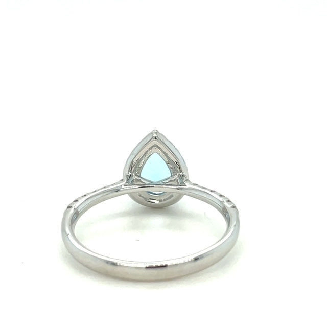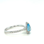This beautiful blue .50 carat Aqua is enhanced by the surrounding 35 round white diamonds, creating a shimmering masterpiece of a ring.