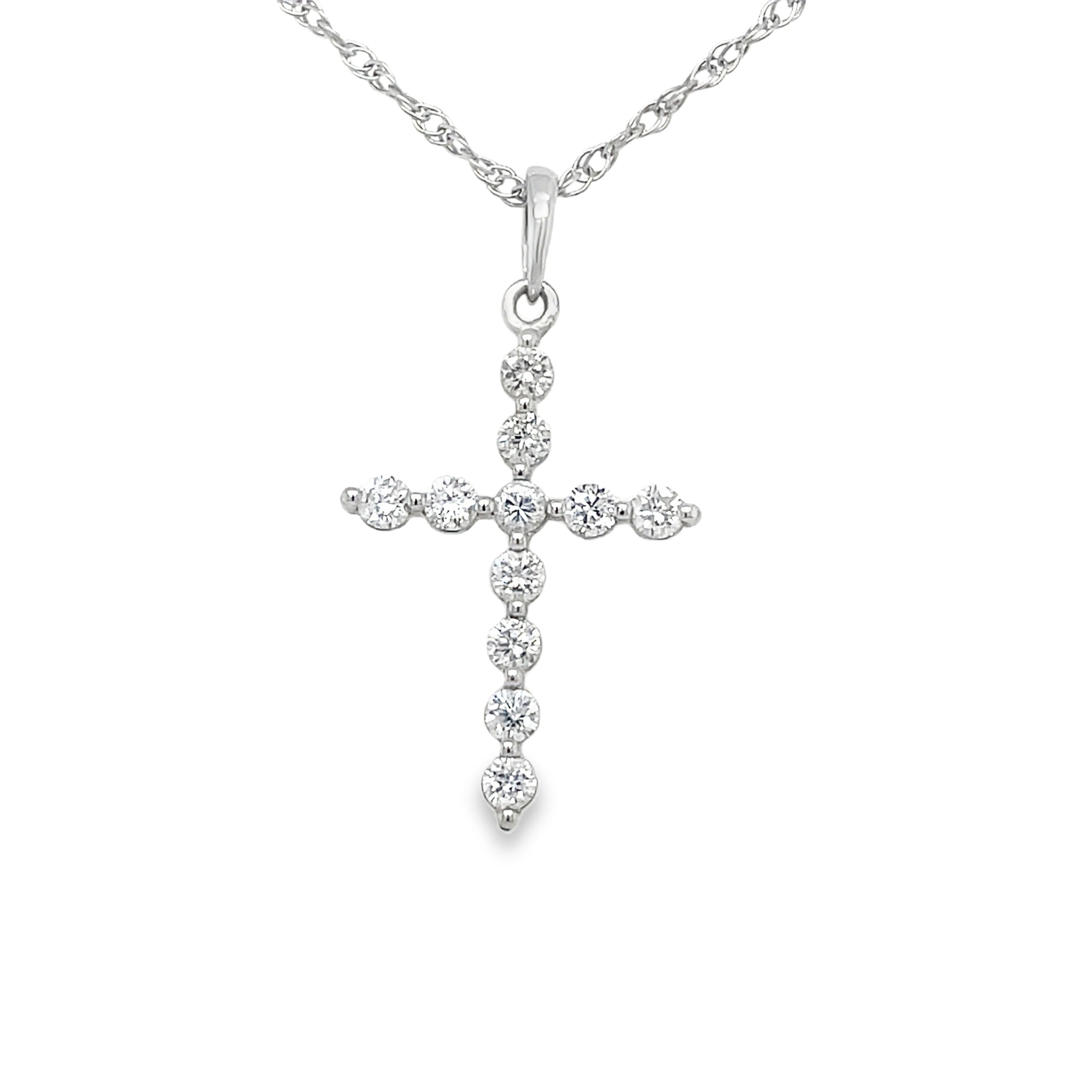 This elegant diamond cross necklace is crafted in radiant 14 karat white gold and set with shimmering round diamonds arranged in a timeless cross silhouette. Each diamond is individually set to maximize brilliance, creating a refined sparkle that catches the light beautifully. Graceful and meaningful, this piece is perfect for everyday wear or as a cherished gift.