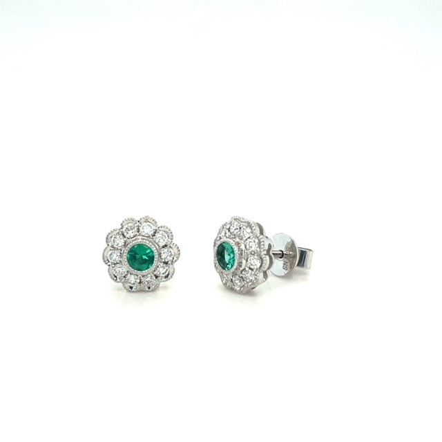 Ten diamonds surround a round emerald center creating these sparkling 14k white gold flower stud earrings.
